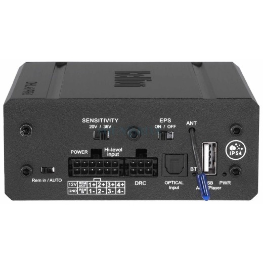 Устройство оборудовано 4-канальным высокоуровневым входом с продвинутой системой подключения. Ключевой особенностью является переключатель чувствительности, позволяющий работать с сигналами до 20 или 36 Вольт RMS, что обеспечивает совместимость с широким спектром штатных аудиосистем. Встроенная система эмуляции нагрузки EPS («обманка») гарантирует корректную работу бортовой электроники автомобиля.