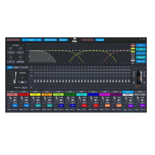 ● 12-канальный 32-х битный звуковой процессор имеет возможность настройки 12-ти равнозначных каналов с 31-полосным параметрическим или графическим эквалайзером, кроссовером с шагом настройки 1Гц и спадом от 6 до 48 дБ/окт., настройку временных задержек, инвертор фазы, регулировку чувствительности каждого из каналов и 10 ячеек памяти.